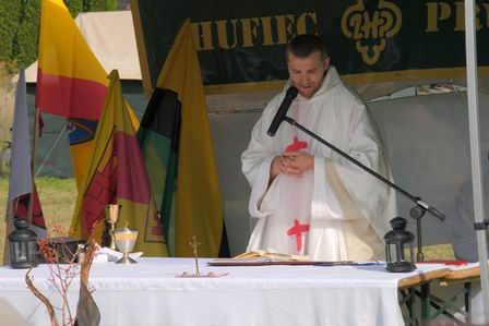 Po uroczystościach na placu apelowym odbyła się msza polowa odprawiana przez druha ks. Jarosława Kuśmierczyka, zakończona poświęceniem nowego sztandaru Hufca ZHP Pruszków. Druh Jarek w kazaniu powiedział, że odprawiana przez niego msza ma w pewnym sensie charakter dziękczynny za możność wchodzenia w ślady takich bohaterów, jak Andrzej Romocki „Morro”, pochodzący z rodziny o tradycjach patriotycznych i głęboko wierzącej. Dzięki takim wzorcom, w harcerstwie odnajdujemy czas przyjaźni, sens zdobywania kolejnych stopni i pokonywania trudności. Taki patron poprowadzi nas i w zabawie, i każdą drogą, zawsze orędując za nami przed Bogiem.