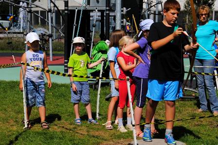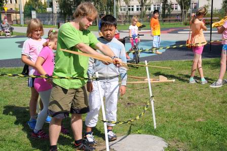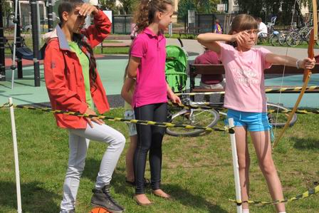 Obok ustawia się kolejka do strzelania z łuku. Strzela nastolatka – nie trafiła nawet w tarczę. Do stanowiska podchodzi 3,5-letni Wojtuś, razem z babcią. Wspólnie zakładają strzałę na cięciwę, mierzą… i strzała trafia w „10”.