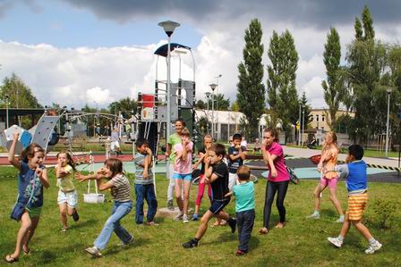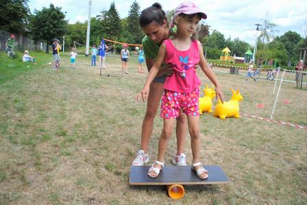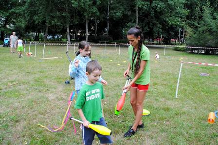 Przy roboczym stanowisku instruktorów bawią się najmłodsze dzieciaki. Korzystają z wszelkiego sprzętu instruktorów: różnokolorowych plastikowych „chopków” przypominających talerze, „maczug” do żonglerki itp. Grupie maluchów przewodzi chyba najstarsza wśród dzieciaków niespełna trzyletnia dziewczynka. – Ja sprzedawam – mówi. Instruktorka Nela podpowiada dzieciakom: – Nazbierajcie liści i kamieni. to będą pieniądze. – Nie, my na niby – odpowiada dziecko. Po chwili zwraca się do młodszej koleżanki: – Teraz ona sprzeduje ze mną.