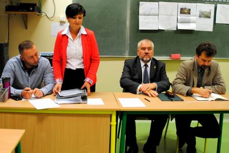 Stół prezydialny w pełnym składzie, od lewej: Michał Rybicki – sekretarz zebrania, Adriana Król-Popiel – sołtys Michałowic Wsi, wójt gminy Michałowice Krzysztof Grabka oraz pracownik urzędu Piotr Pacyną |
