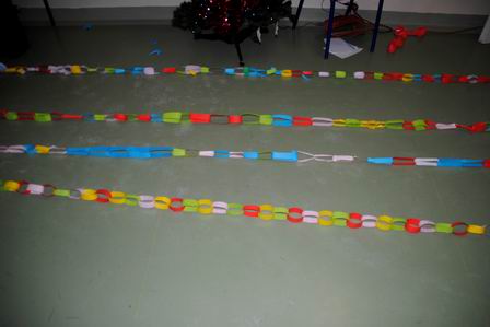 Łańcuchem dzieci przyozdobiły szkolny korytarz. Zrobiło się jeszcze piękniej i jeszcze bardziej wesoło. Można więc było zaprosić Mikołaja. Ten przybył, z ogromnym workiem prezentów.