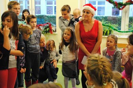Bawiły się – znakomicie – dzieci w wieku od 3 do 15 lat. Zabawę prowadziły: Mikołajowa Katarzyna, śnieżynka Karolina oraz elf Mateusz. Zabrakło natomiast Mikołaja. Początkowo dzieci pytały o niego, ale w trakcie zabawy chyba o nim zapomniały, bo przestały pytać. Mikołaj jechał z prezentami, z daleka, z Laponii – wytłumaczyła męża Mikołajowa.