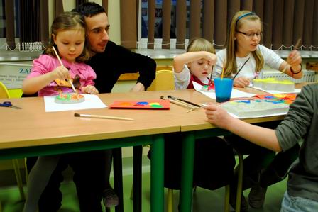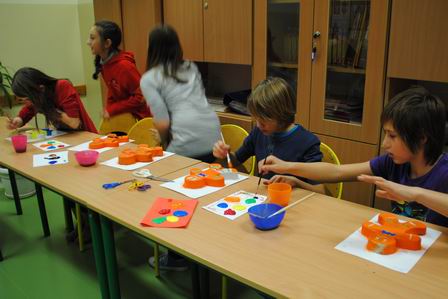 Nieco zmęczone, pokrzepiły się sokiem, wodą i ciasteczkiem; zasiadły wszystkie przy dłuuuugim stole. Zaczęło się wielkie malowanie czarodziejskimi farbkami postaci: Mikołajów, ciastkowego potwora…