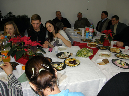 A potem był czas na poczęstunek, na stole pojawiły się świąteczne potrawy: barszcz, pirogi i oczywiście ryby: karpie i śledzie. Suchy Las jest małą miejscowością, mieszkańcy świetnie się znają. Przy świątecznych stołach od razu zapanowała miła, świąteczna atmosfera.