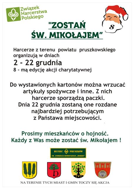 Już po raz ósmy Hufiec ZHP Pruszków organizuje akcję charytatywną „Zostań św. Mikołajem”, polegającej na zbiórce produktów żywnościowych dla najuboższych osób z Powiatu Pruszkowskiego.