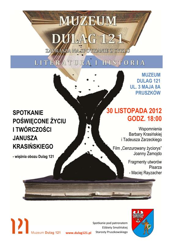 Zapraszamy na kolejne spotkanie z cyklu „Literatura i Historia”, które odbędzie się 30 listopada o godzinie 18:00 w siedzibie Muzeum Dulag 121 . Będzie poświęcone życiu i twórczości zmarłego 14 października 2012 r. pisarza Janusza Andrzeja Krasińskiego.