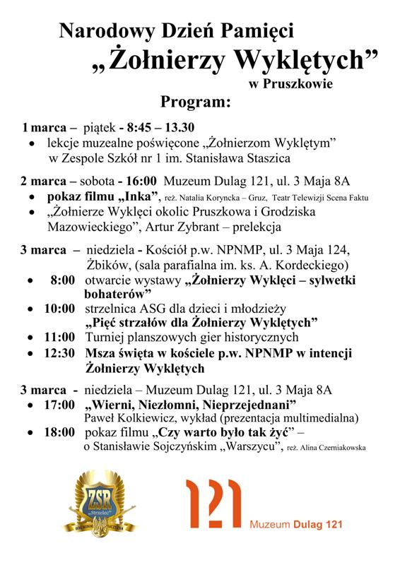 Muzeum Dulag 121 i Związek Strzelecki Rzeczpospolitej „Strzelec” zapraszają na obchody Narodowego Dnia Pamięci „Żołnierzy Wyklętych” w Pruszkowie, które odbędą się w dniach 1-3 marca na terenie Pruszkowa.