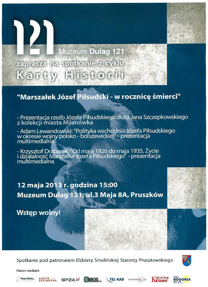 12 maja – w 78. rocznicę śmierci Józefa Piłsudskiego Muzeum Dulag 121 oraz Związek Strzelców Rzeczypospolitej zaprasza na spotkanie poświęcone Pierwszemu Marszałkowi Polski. W niedzielne popołudnie – o godzinie 15. wysłuchamy dwóch wystąpień oraz obejrzymy maskę pośmiertną Piłsudskiego wykonaną przez Jana Szczepkowskiego.