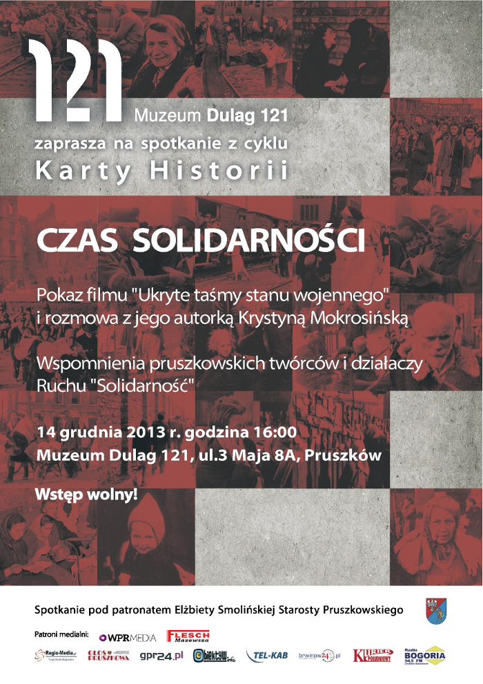 Elżbieta Smolińska Starosta Pruszkowski i Muzeum Dulag 121 zapraszają 14 grudnia o godz. 16 na spotkanie poświęcone historii stanu wojennego oraz NSZZ "Solidarność". W programie pokaz filmu „Ukryte taśmy stanu wojennego" i rozmowa z jego autorką Krystyną Mokrosińską oraz wspomnienia pruszkowskich twórców i działaczy Ruchu "Solidarność".