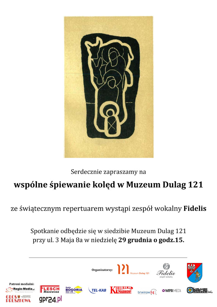 Bardzo miło będzie nam gościć w Muzeum Dulag 121 wszystkie osoby związane z jego działalnością –świadków historii, byłych więźniów, którzy w 1944 roku przeszli przez obóz przejściowy Dulag 121 w Pruszkowie i zdecydowali się podzielić z nami opowieścią o swoich losach, kombatantów oraz tych wszystkich, którzy wspierają nas w naszych działaniach muzealnych. Zapraszamy również osoby, które chciałyby w ten dzień odwiedzić Muzeum, wysłuchać koncertu kolęd w wykonaniu Zespołu Fidelis i wziąć udział we wspólnym śpiewaniu kolęd.